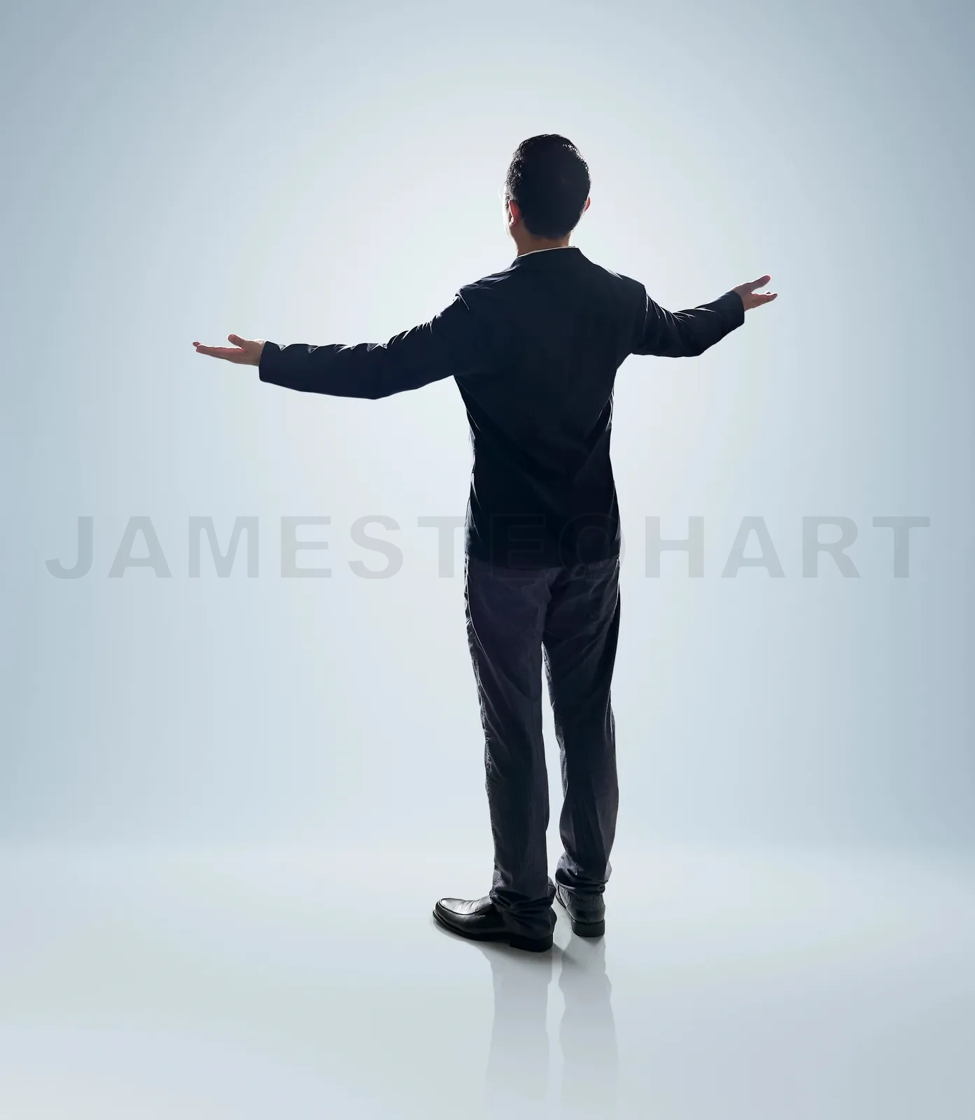 Rear view angle of Businessman standing and lift up the hands pose. Isolated on white background with clipping path.