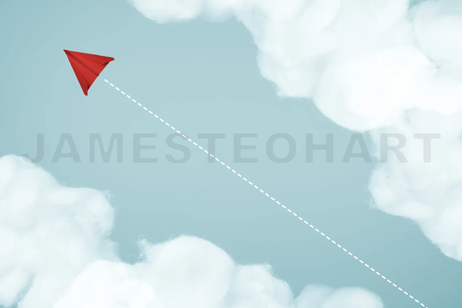 Red paper plane flying high on an upward dashed line path among white clouds in a blue sky