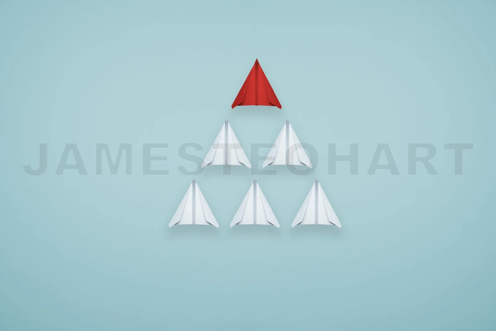 Red paper plane leading a group of white paper planes, representing business leadership and innovation