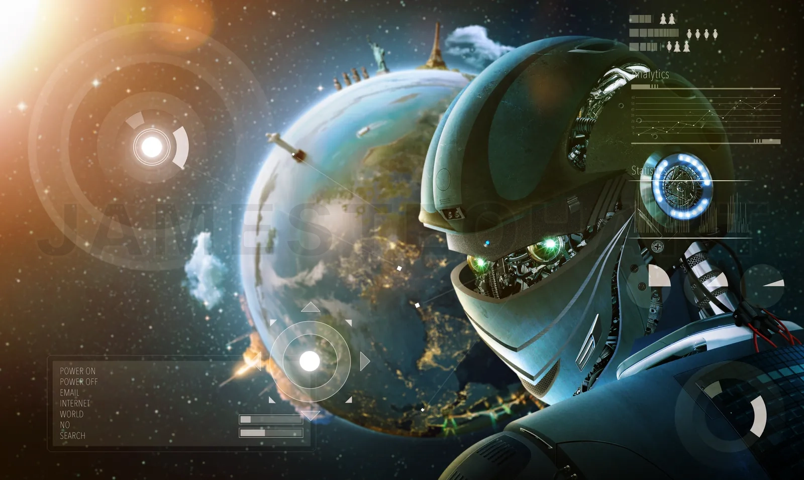 Robot stylish looking back with planet Earth from space. Future technology concept, artificial intelligence. Elements of this image furnished by NASA