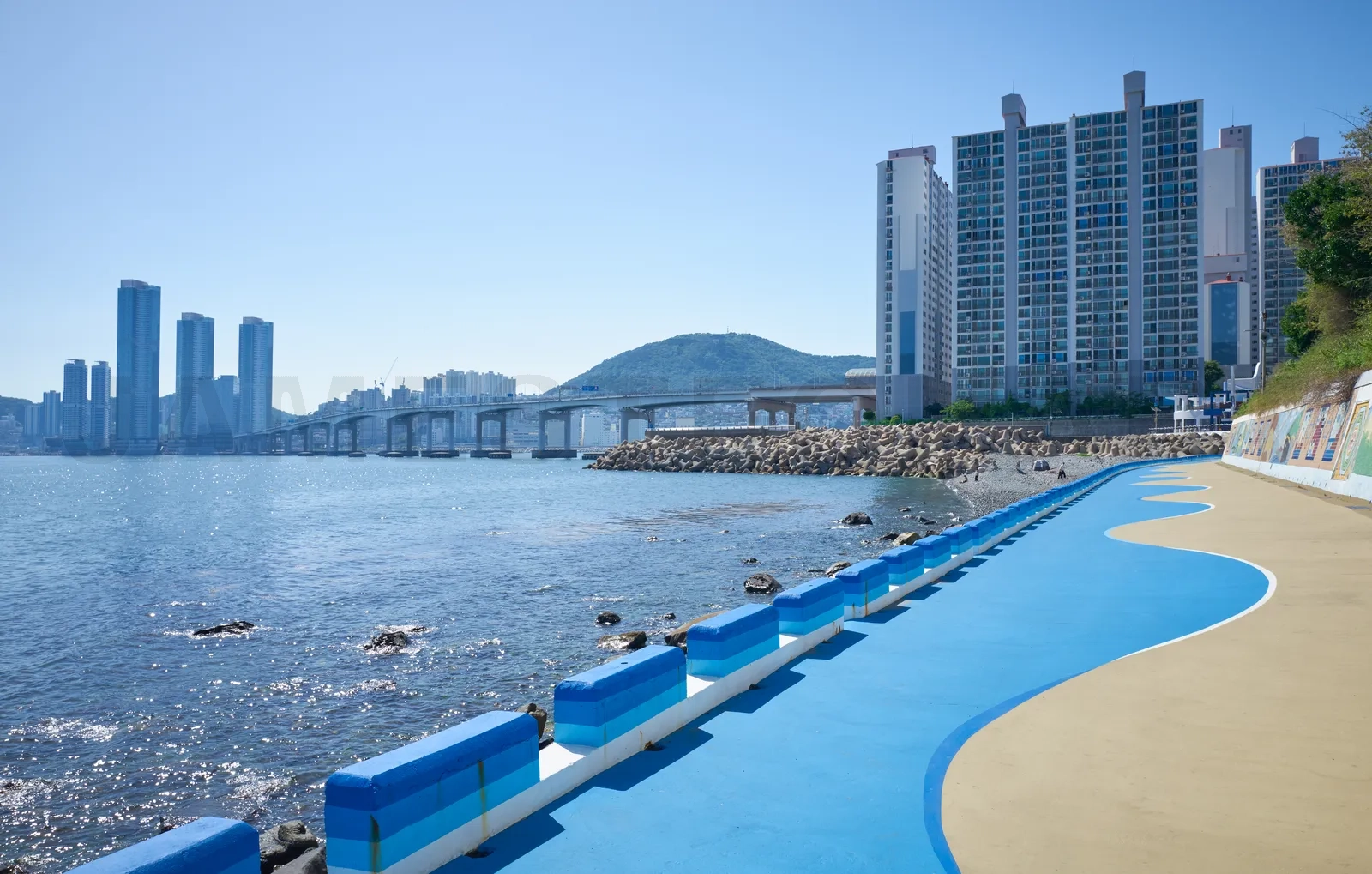 Picturesque walkway along the coast huinnyeoul culture village in busan, south korea, offering stunning views of the bridge, cityscape, and ocean