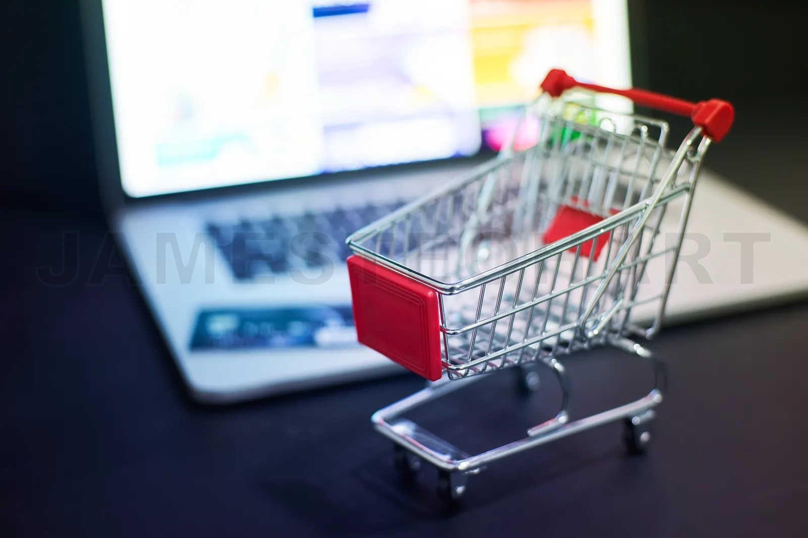 Shopping cart or trolley in front of Laptop , online marketing and business trading concept. Selected focusing .