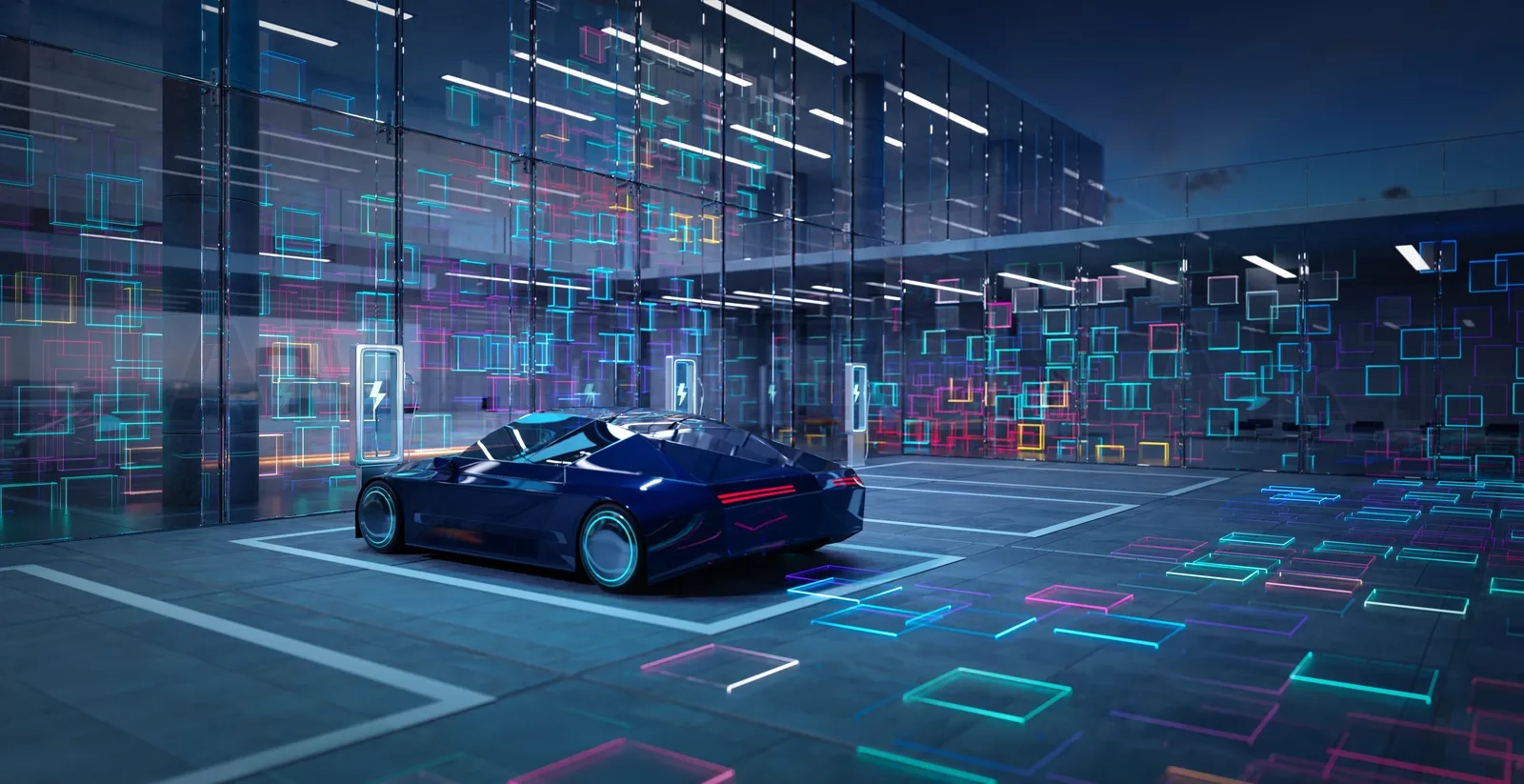 Electric car charging in a modern parking garage with glowing digital interface and colorful neon lights. 3D rendering