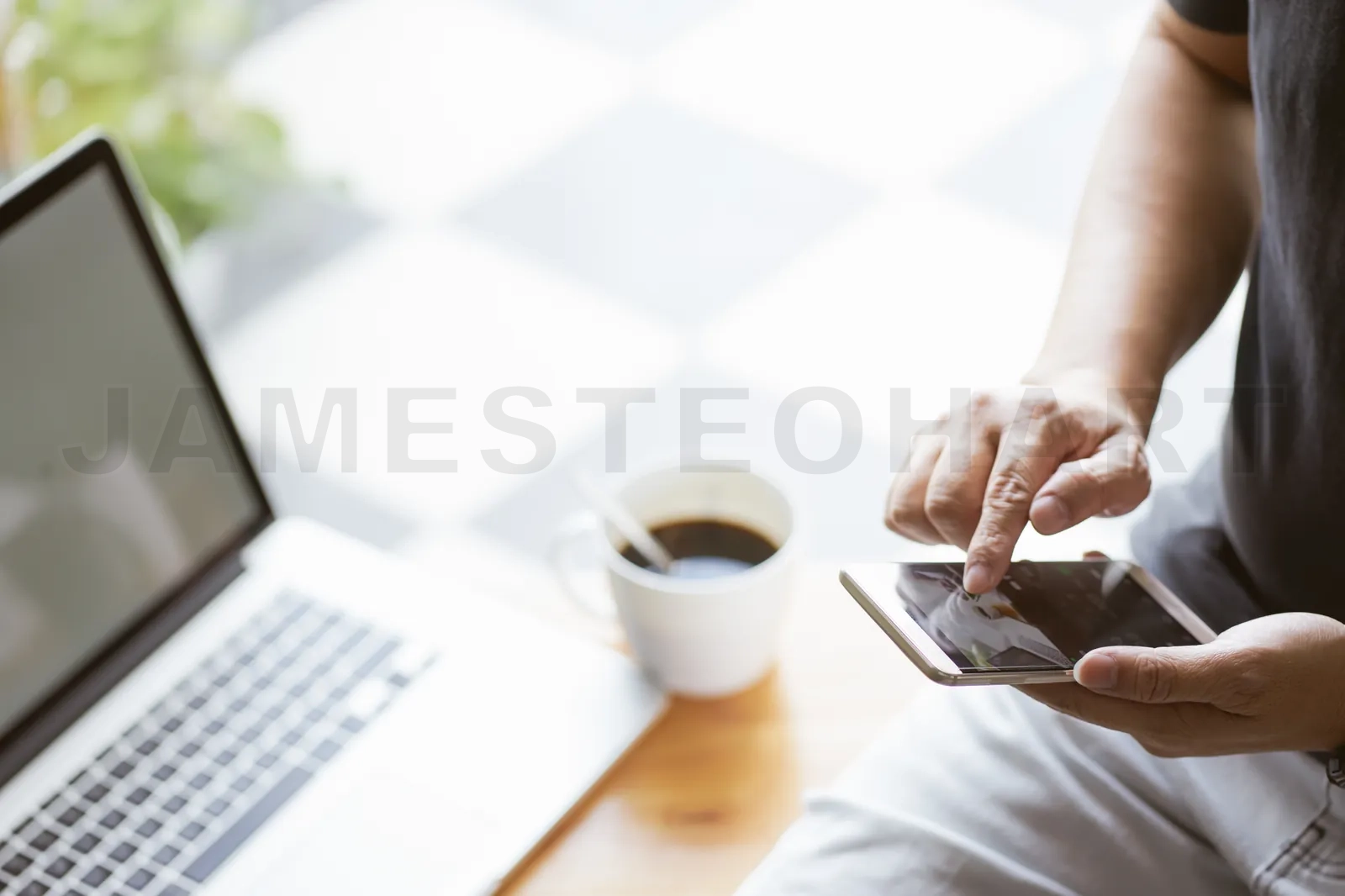 Smartphone in young man hand with blur laptop and coffee background , selective focusing .