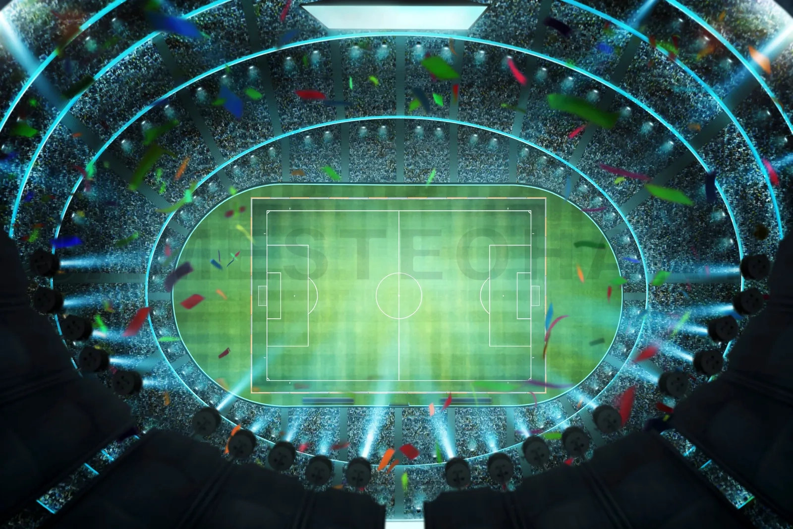 Football stadium with a large crowd, bright lights, and falling confetti celebrating an event