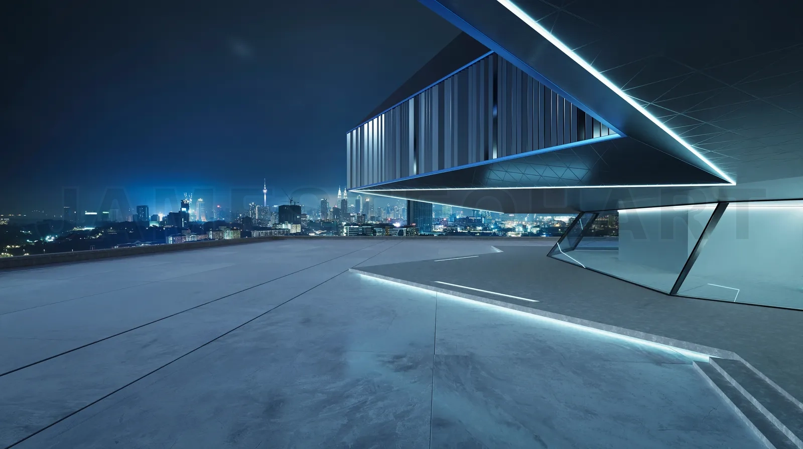 Perspective view of empty cement floor with steel and glass modern building exterior. Night scene. Photorealistic 3D rendering.
