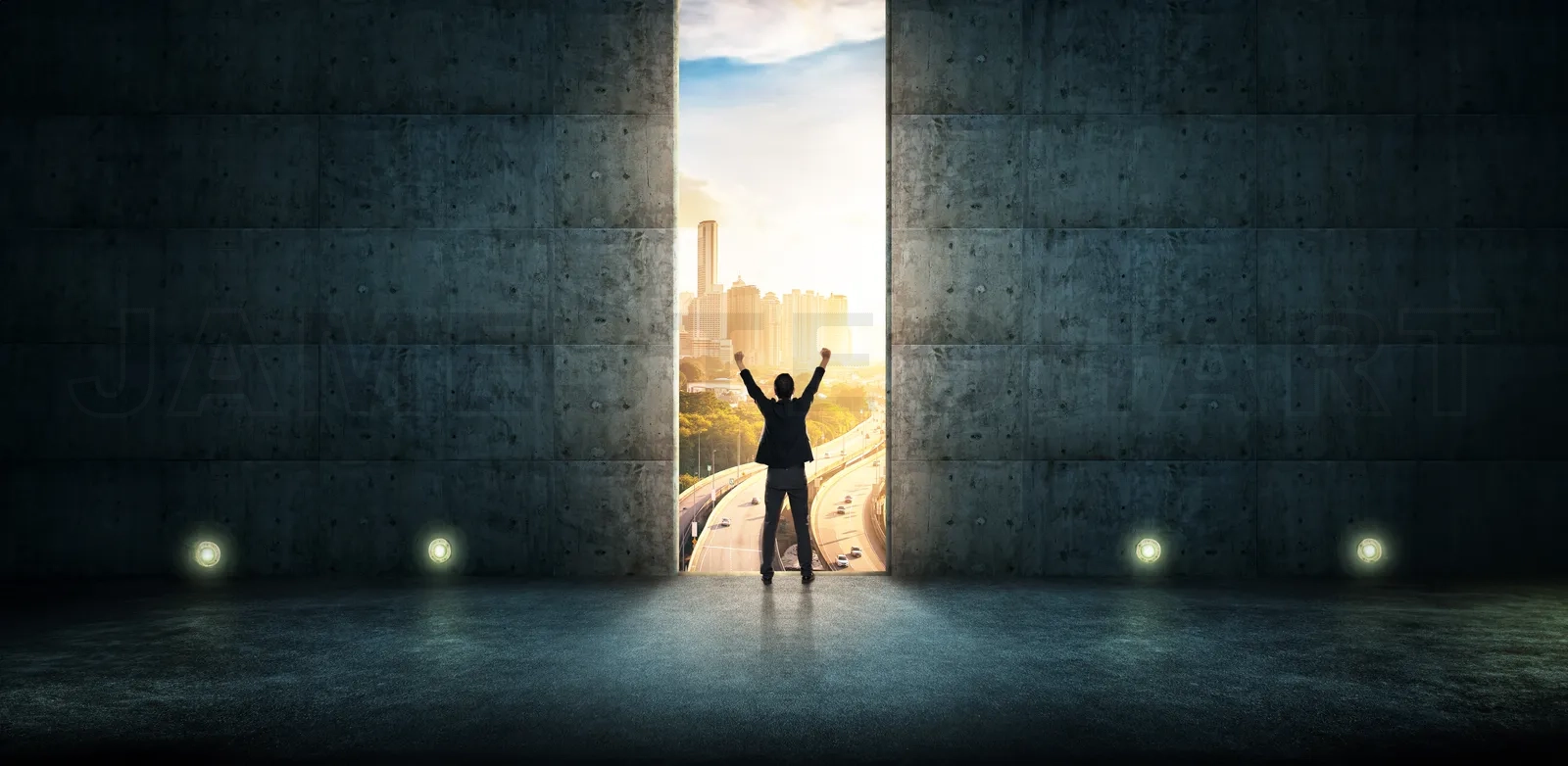 Success businessman cheering against concrete wall with huge door ,sunrise scene city skyline outdoor view .