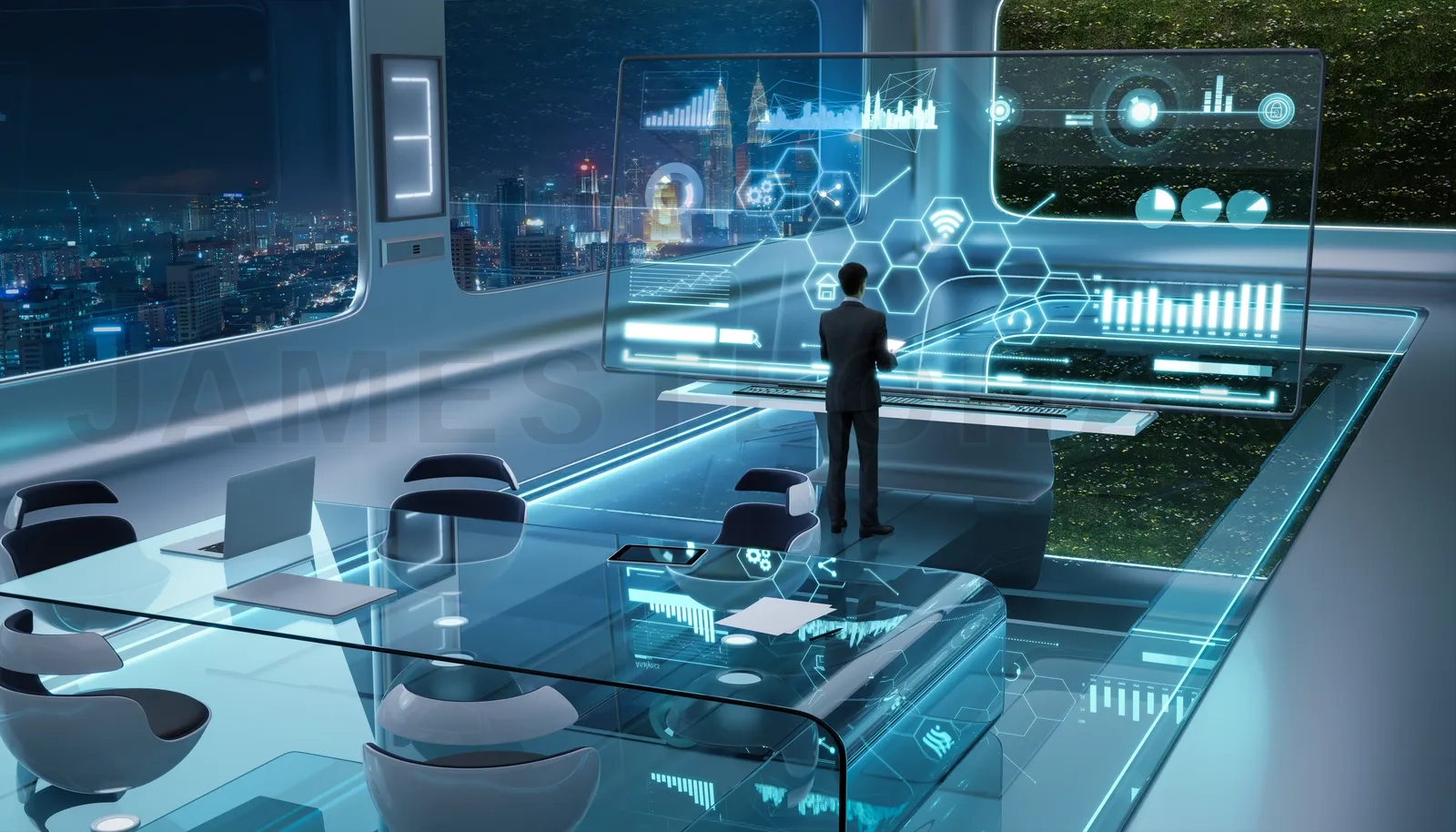 Successful smart businessman work at modern futuristic office. 3d rendering