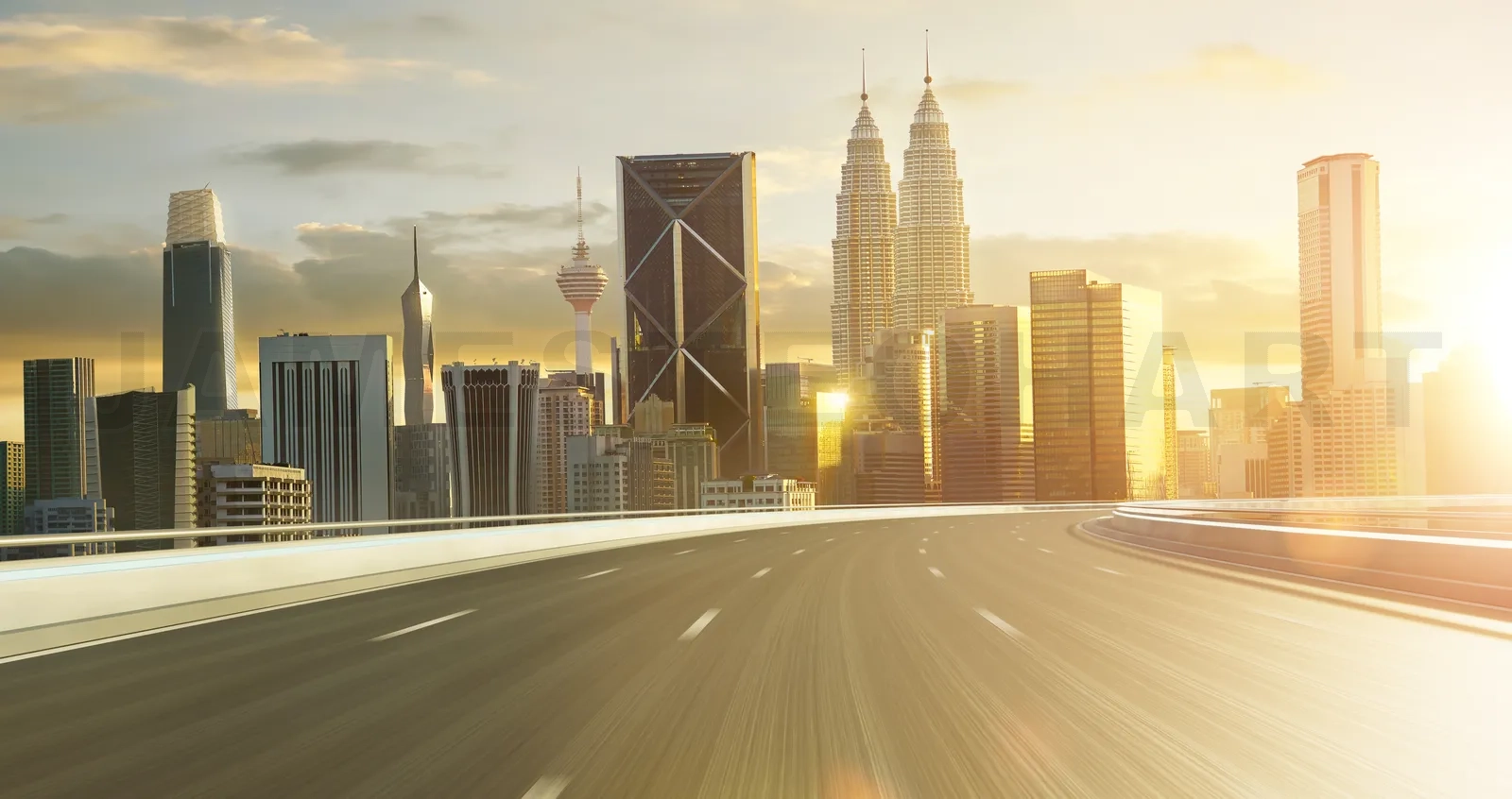 Golden hour city skyline viewed from a smooth urban highway