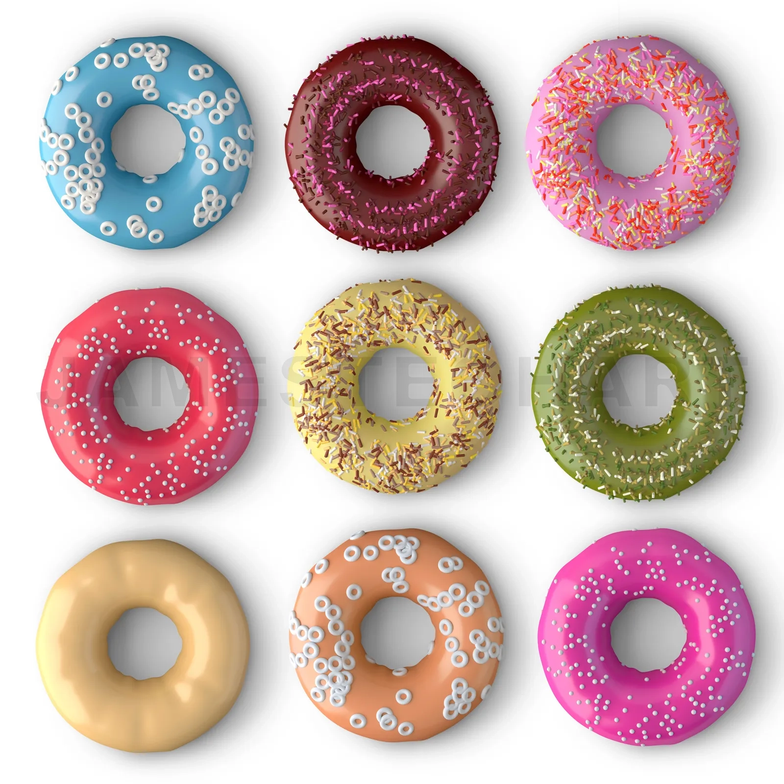 Top view various donut isolated on white background . 3d rendering .