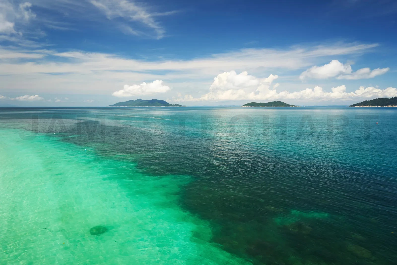 Tropical ocean water flowing near islands under a blue sky with clouds