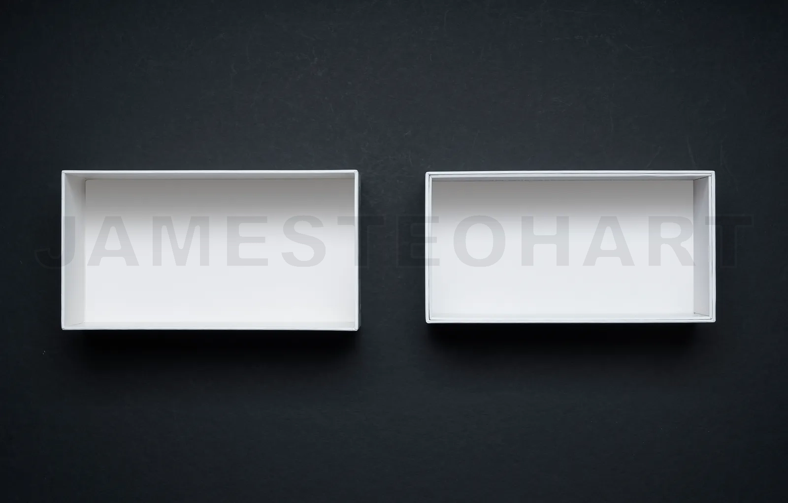 Two empty white rectangular boxes creating a minimalist composition on a dark backdrop
