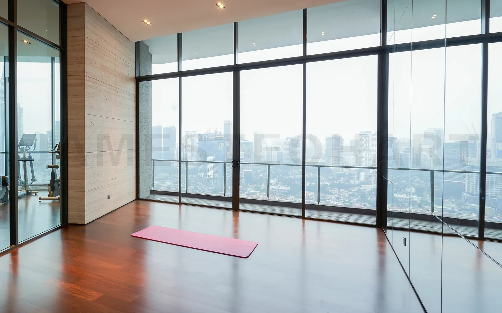Unrolled yoga mat on wooden floor in fitness center with cityscape scene