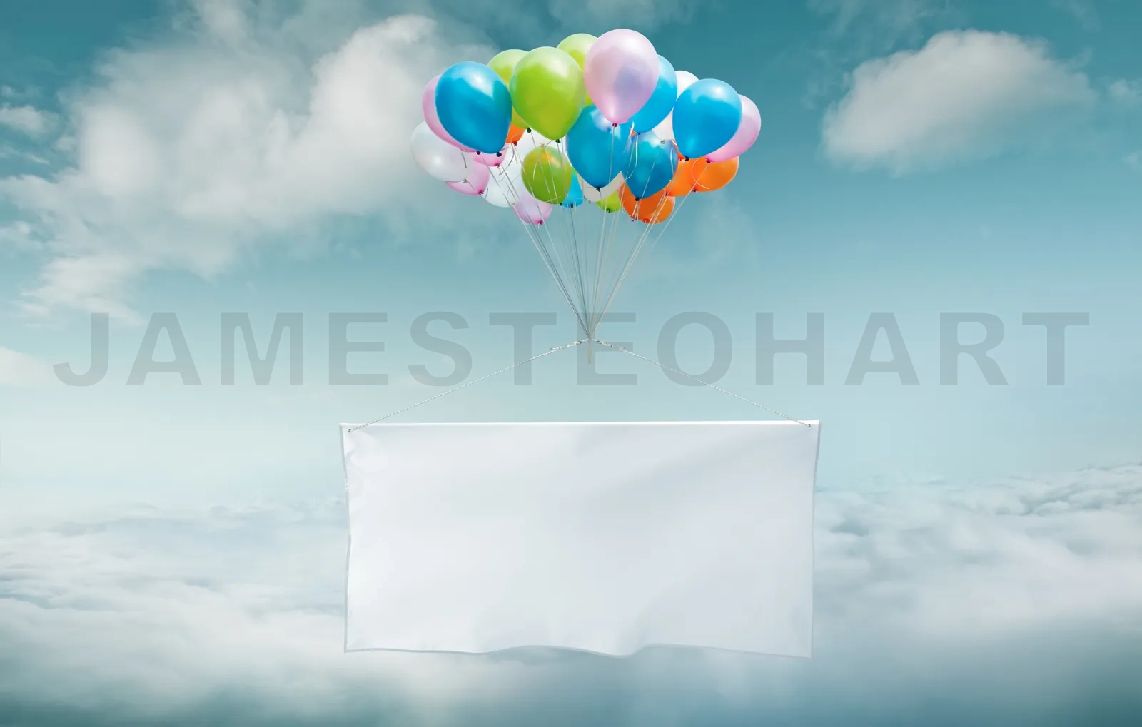 White advertising blank banner floating in sky with bunch of colorful balloons .