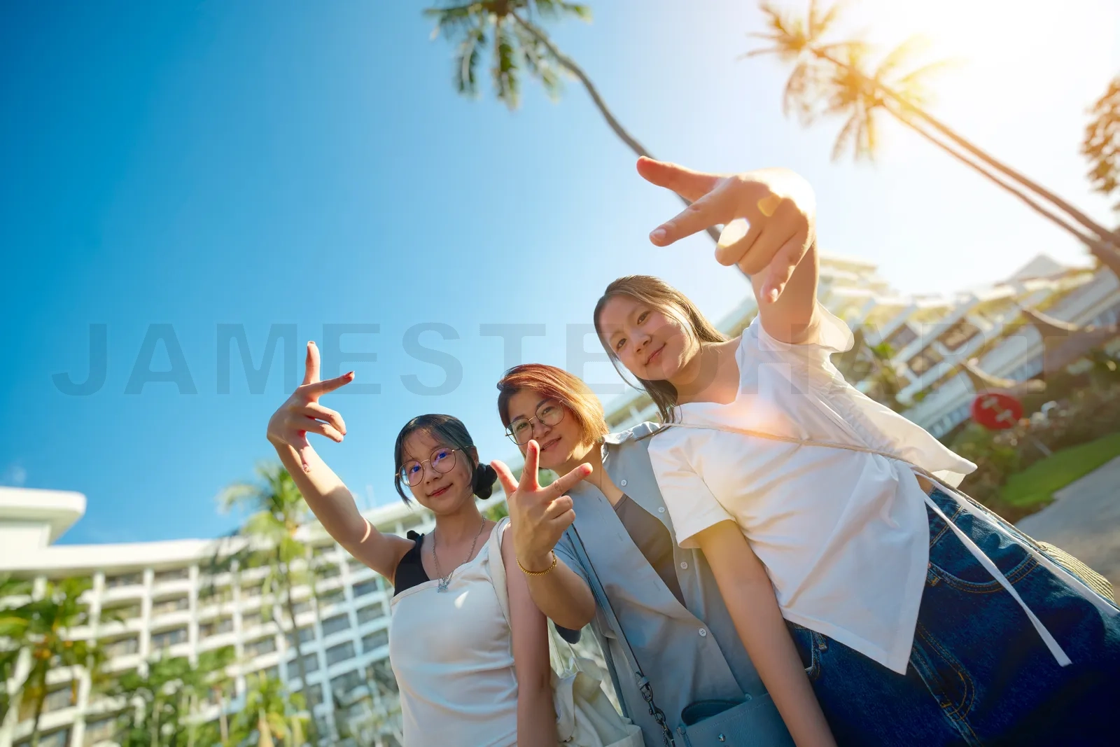 Three friends smiling and making hand gestures during a fun summer vacation on penang island