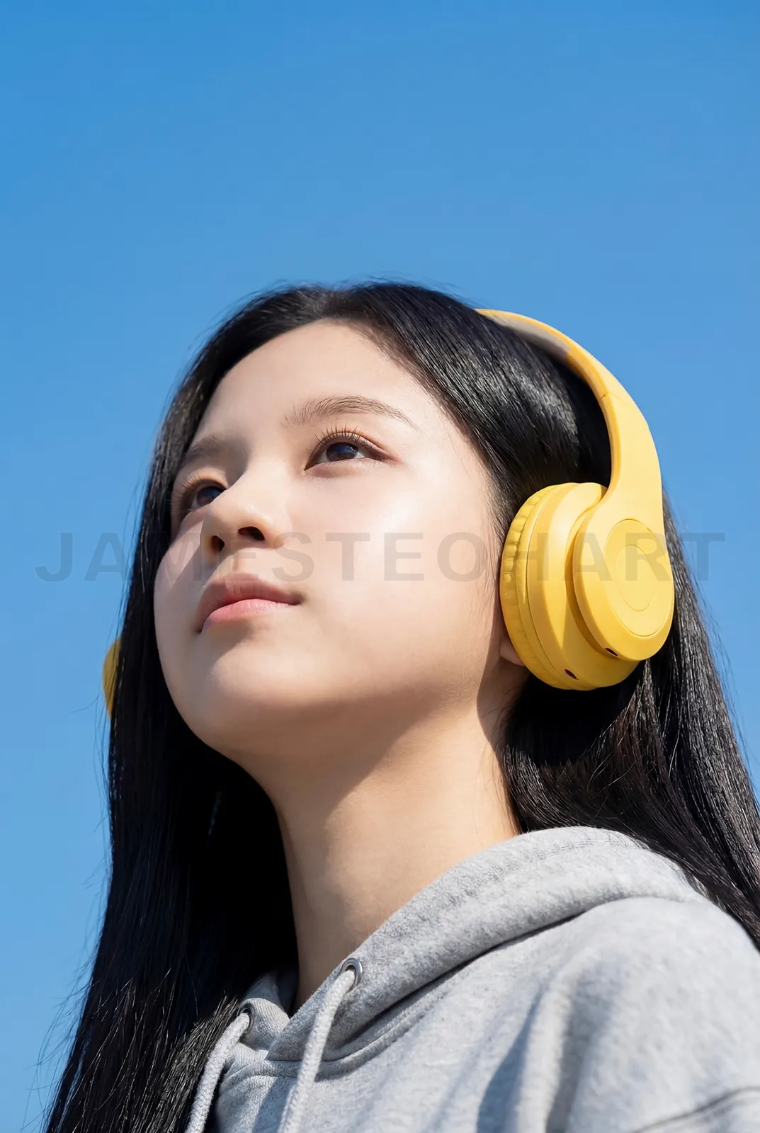 Young asian woman listening to music on yellow headphones, looking up at blue sky