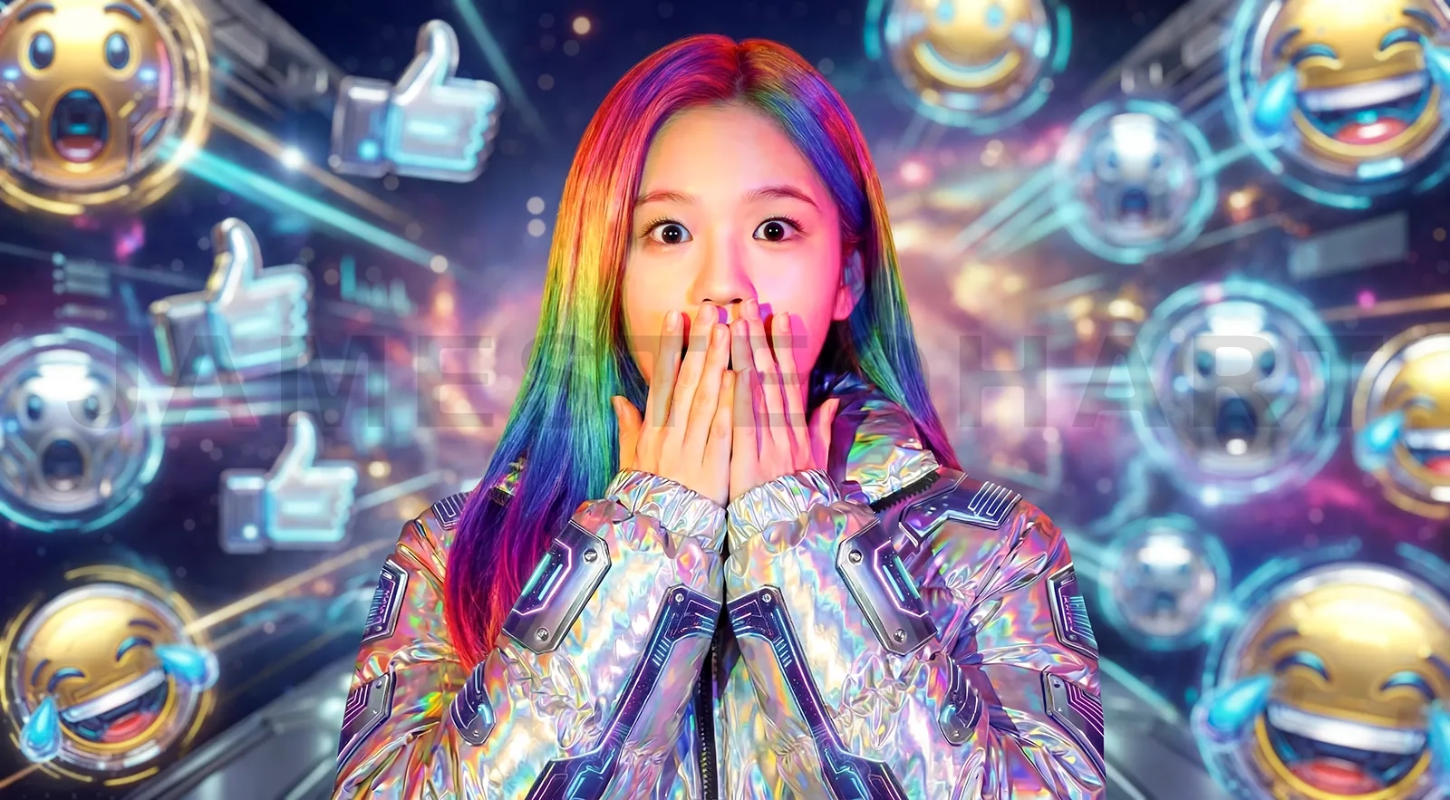 Young woman covering mouth, surrounded by virtual emojis and thumbs-up symbols in a digital space