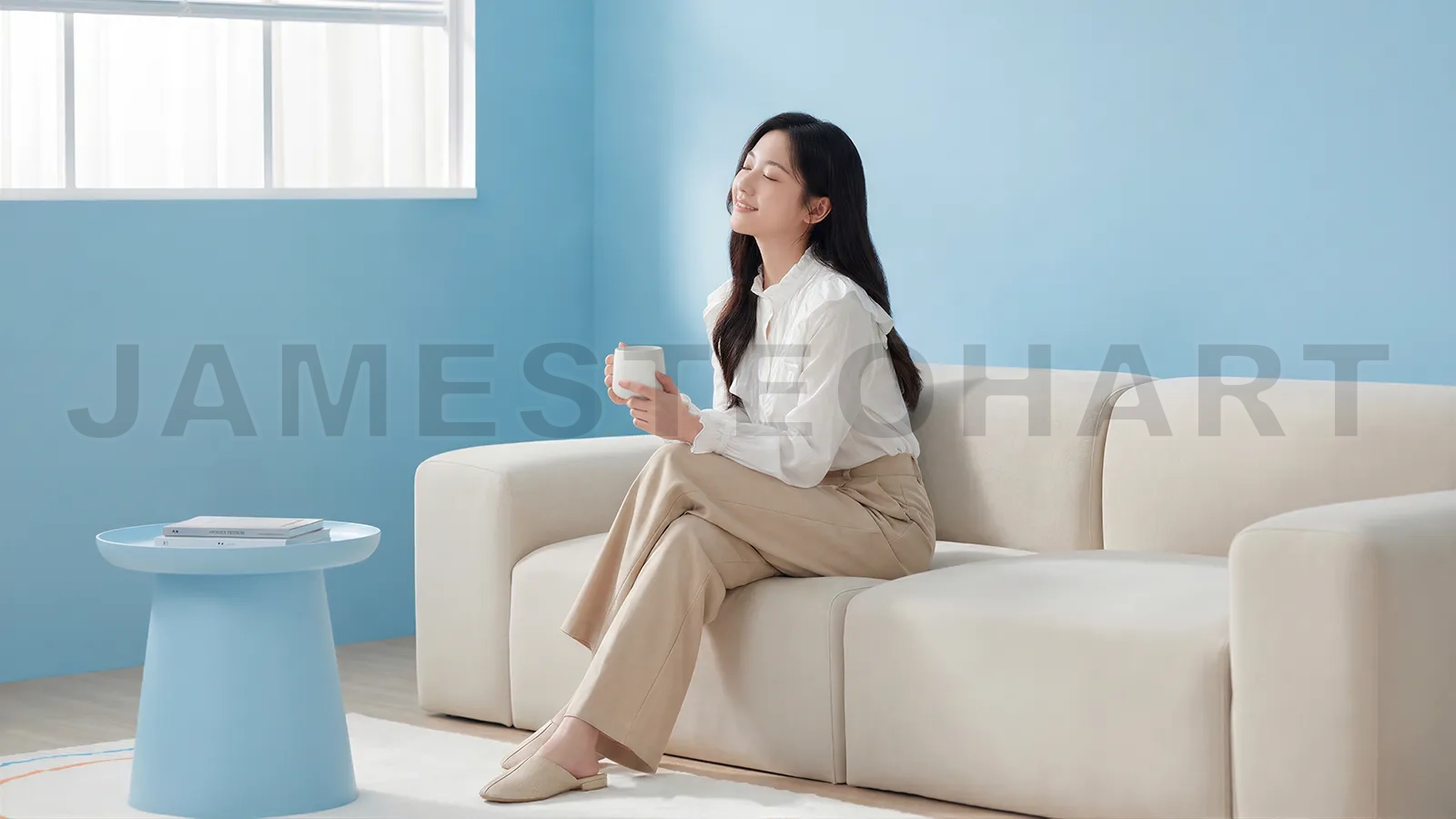 Young woman sitting on sofa, holding a coffee cup, eyes closed, enjoying a moment of tranquility