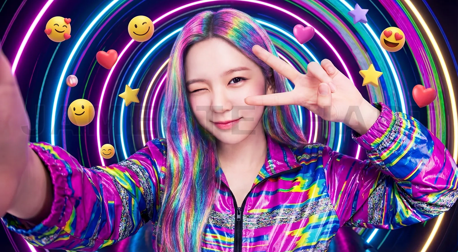 Young woman taking a selfie surrounded by emojis and neon lights, depicting social media addiction